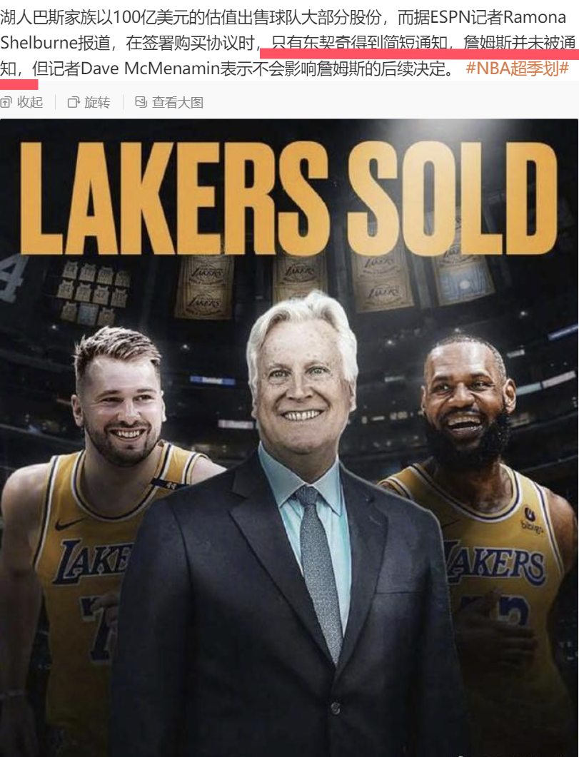 因为这个新老板过来之后,二话不说,先给詹姆斯来了个下马威,他已经通过实际行动传达出了他的态度,现在的这支湖人,东契奇才是真正的老大。洛杉矶湖人的官方权威记者,也是珍妮巴斯的好朋友,洛城本地名记Ramona就带来了一个重大爆料,在这支球队被卖的时候,新老板只给东契奇发了一条短信,通知了他一声,根本就没搭理詹姆斯。
