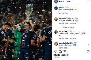 值得一提的是,前巴黎球队贝克汉姆留言为巴黎点赞:Number one 💙🤍❤️