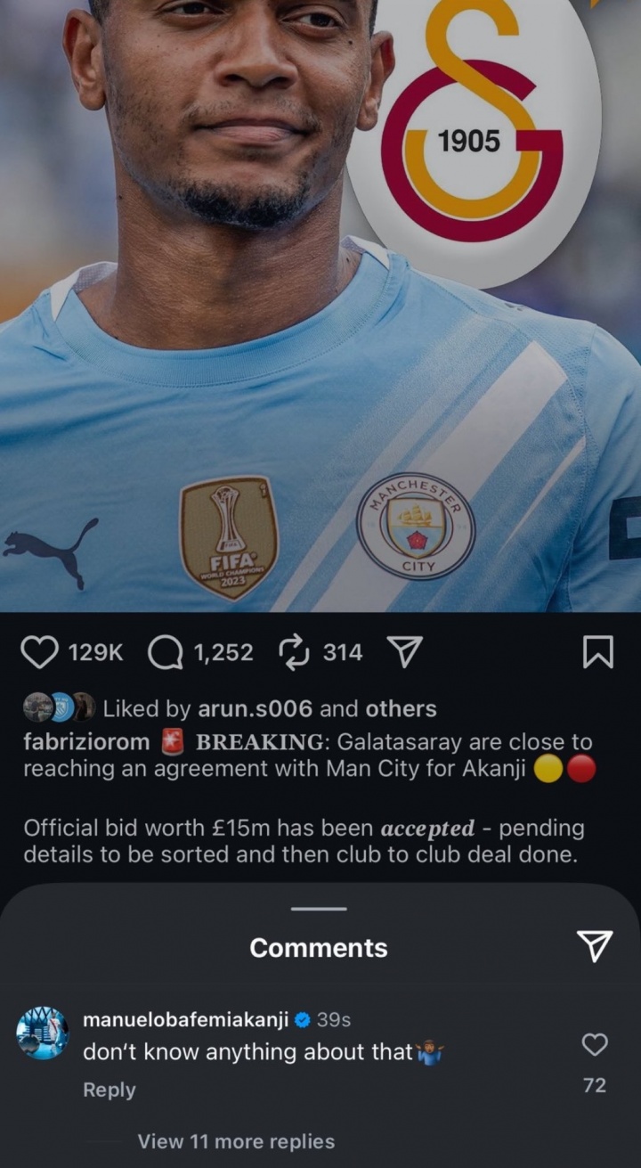 然而阿坎吉本人在罗马Ins贴文下留言回应:“我对此完全不知情。”