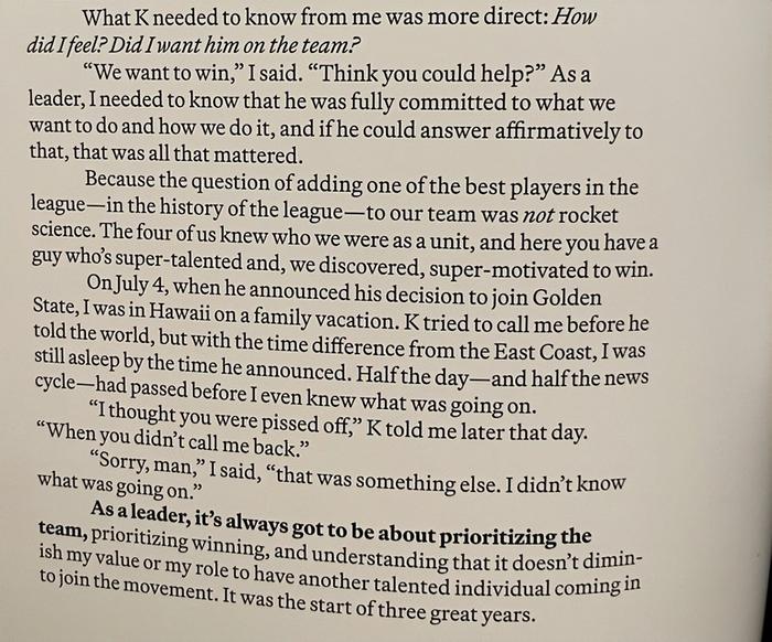 作为一名领导者,永远要把球队、把赢球放在首位,并且要明白,另一位有天赋的球员加入进来,并不会削弱我的价值或我的角色。这是美好三年的开端。