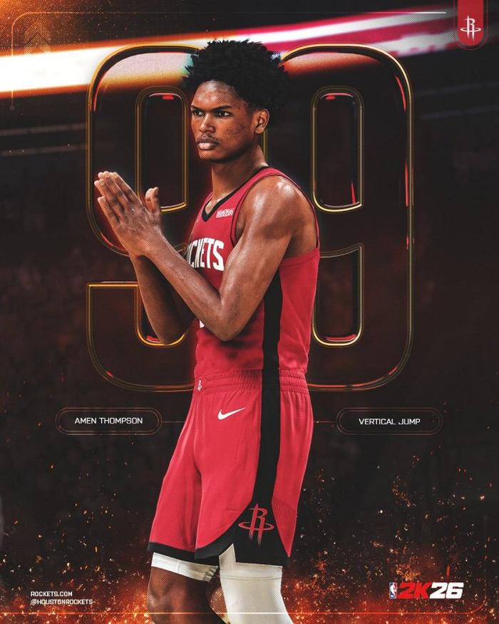 火箭官方社媒今日晒出一张图,阿门-汤普森是NBA2K26中唯一一个垂直弹跳能力值99的球员,也是最高的。