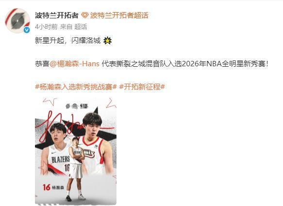NBA官方和波特兰开拓者也发文祝贺杨瀚森入选NBA全明星新秀赛。