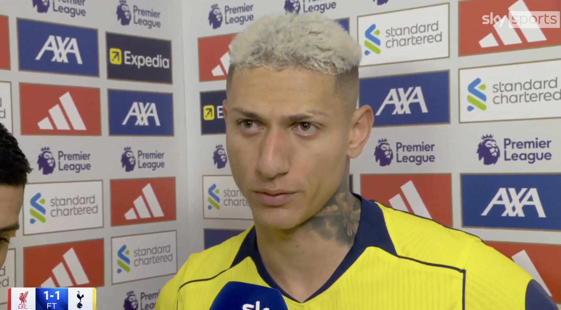 英超第30轮,热刺客场1-1战平利物浦,此役打入扳平比分进球的热刺前锋里沙利松赛后接受了天空体育的采访。